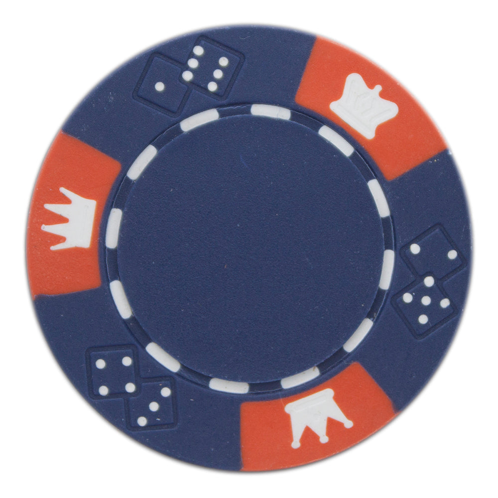 Our Crown & Dice poker chips feature three trapezoid edge spots and a showy casino-inspired mold of craps dice rolling lucky 7s.